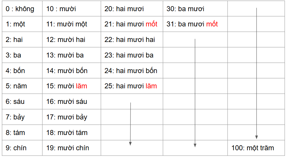 Following these rules, you can count up to 100 (một trăm) in Vietnamese.